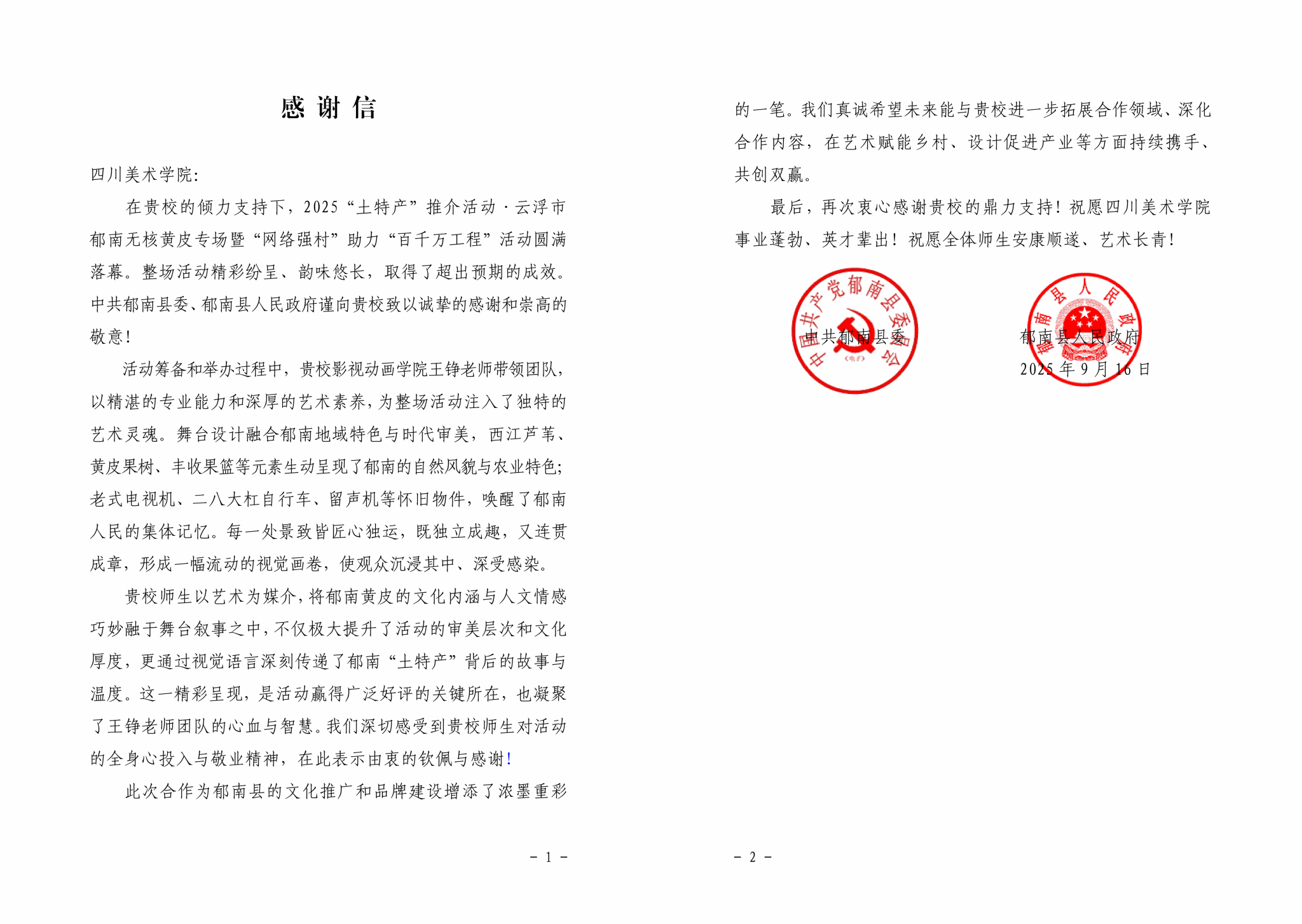 近日,中共广东省云浮市郁南县委、广东省云浮市郁南县人民政府向我校发来感谢信,对我校师生团队在2025“土特产”推介活动·云浮市郁南无核黄皮专场暨“网络强村”助力“百千万工程”活动中作出的贡献表示感谢。同时期待未来与我校进一步拓展合作领域、深化合作内容,在艺术赋能乡村、设计促进产业等方面持续携手、共创双赢。