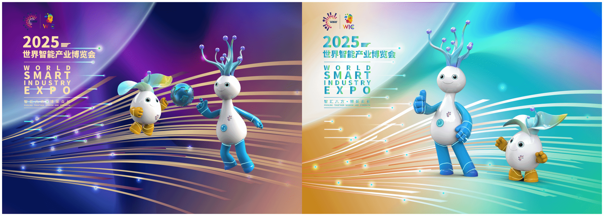 本次形象系统升级基于“智能科技、未来时尚、灵动炫彩、友好亲民”四个关键词的设计定位,针对现有吉祥物“智崽崽”与“慧乐乐”的形象系统进行优化设计。优化材质,突出“液态金属”质感光泽,增加模拟电路光轨的手足部件接缝处荧光线条;深化细节,手部升级为“分段式金属管”结构的可活动指节,脚部升级为半月形“多功能机械足”,既呼应“智慧”元素,又符合机械关节的运动逻辑;升级色彩,以“宇宙蓝+山城金”为主色调,分别以“银→钛白→蓝→紫”与“绿→银→钛白→金”的渐变呈现未来韵律。整体升级既延续“智汇八方,博采众长”的视觉叙事,又具备更鲜活的可感知性与场景适配性。