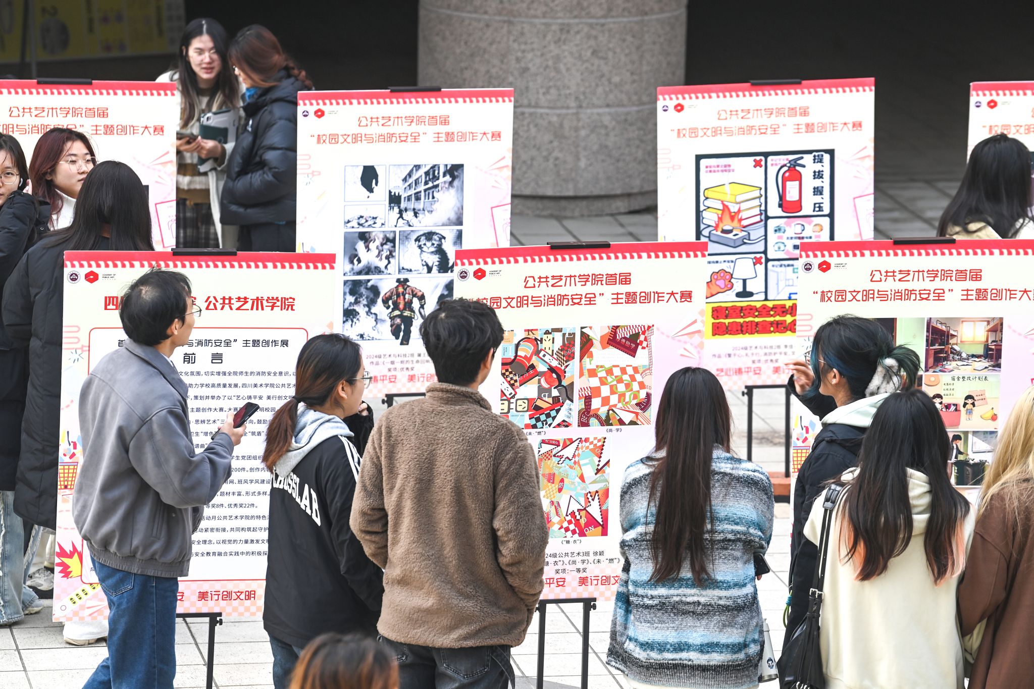 12月1日,公共艺术学院首届“校园文明与消防安全”主题创作展在黄桷坪校区举行,展览以“艺心铸平安 美行创文明”为主题,线下展览将持续一周。