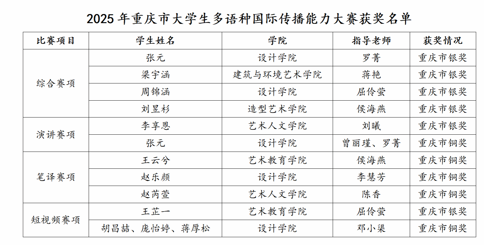 近日,《重庆市教育委员会关于2025“外研社·国才杯”“理解当代中国”重庆市大学生多语种国际传播能力大赛获奖情况的通报》发布,我校学子凭借扎实的专业素养与卓越的综合能力,斩获6枚银牌、5枚铜牌的好成绩。