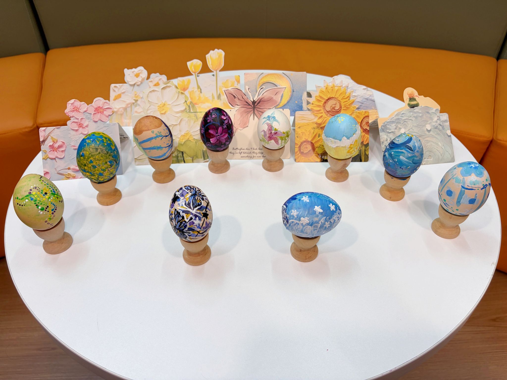 在创作环节,同学们以这些鸡蛋为载体,运用丙烯颜料和画笔,将裂痕转化为创作元素:有人将裂痕化作花瓣纹路,勾勒出向阳而生的花朵;有人把裂痕延伸为阳光射线,传递出冲破困境的力量;还有人借助裂痕托描绘出象征成长力量的图案。整个过程在轻柔的音乐中进行,氛围专注而温暖。完成作品后,同学们为作品命名并写下创作寄语,进一步深化对主题的理解。