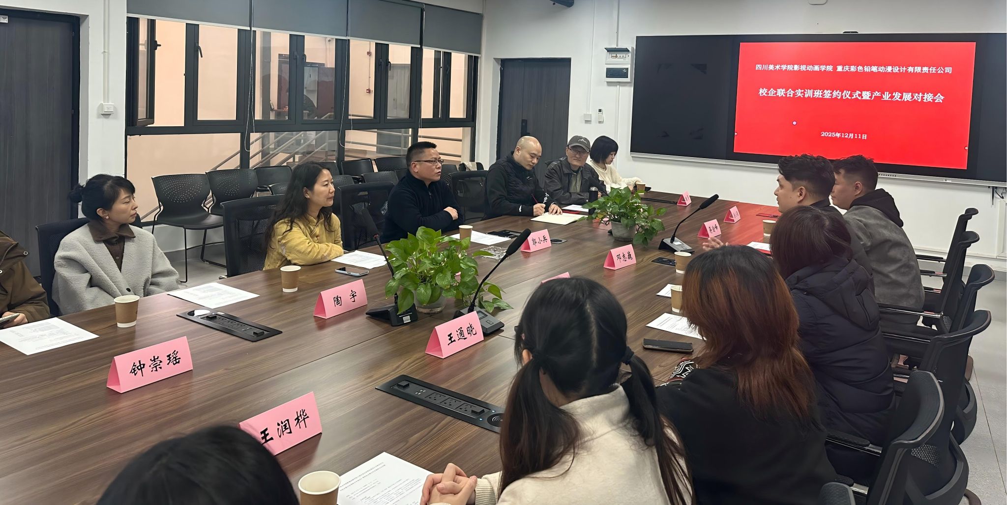 12月11日,影视动画学院与重庆彩色铅笔动漫设计有限责任公司举行校企联合实训班签约仪式暨产业发展对接会,影视动画学院党政领导、动画系主任及骨干教师,重庆彩色铅笔动漫设计有限责任公司管理团队及创作骨干参会。