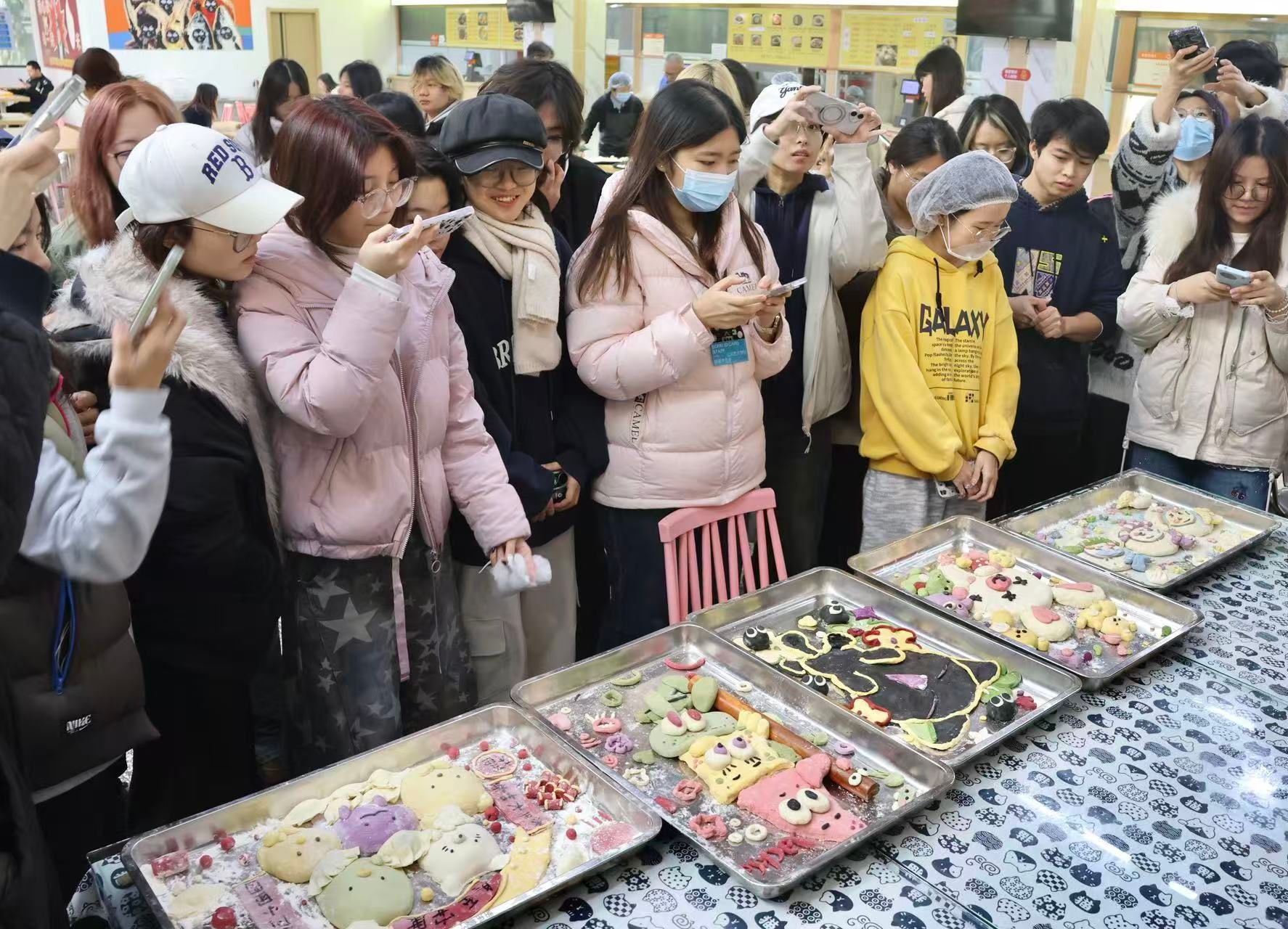 大赛设置“速度赛”与“创意赛”两轮赛程。速度赛中,各队分工有序、动作娴熟,在30分钟内争分夺秒,比拼效率与质量,展现了团队默契与动手能力,冠军组累计制作600余个饺子。创意赛中,同学们将面团混合蔬菜汁,创造出雪人、小猫、松鼠等造型别致的饺子,让传统美食成为一件件充满巧思的“可食艺术品”。