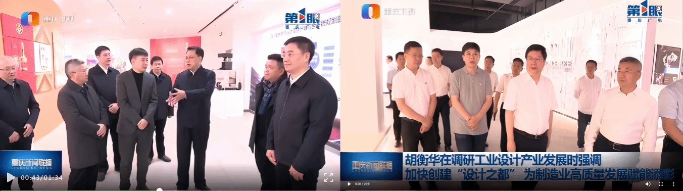 (左:袁家军书记视察川美设计专业成果展 右:胡衡华市长视察川美工业设计中心服务新兴产业发展设计成果)