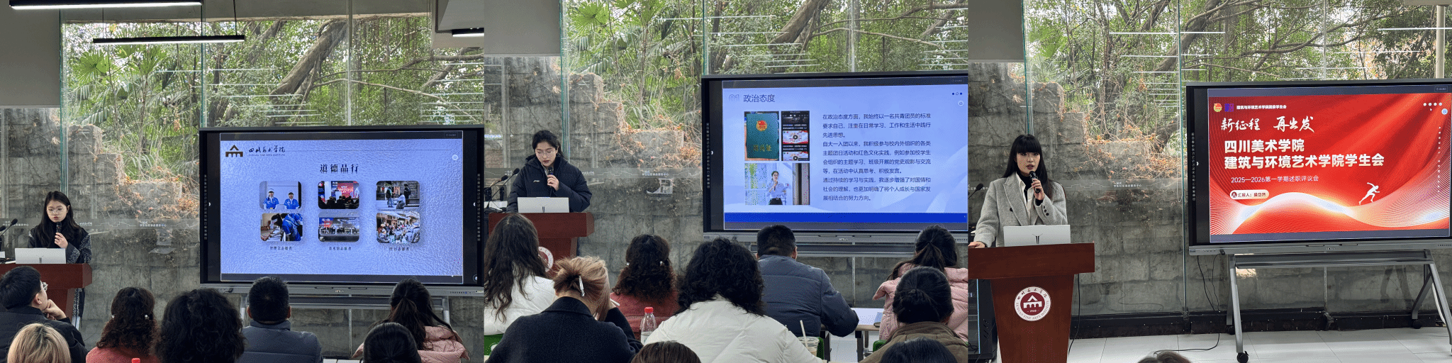 在述职环节,述职人员态度认真、汇报充实,展现了良好的政治素养、工作作风和综合素质。大家围绕岗位职责,系统汇报了在组织建设、品牌活动、服务同学、校园文化等方面取得了积极成效,切实发挥学生会桥梁纽带作用,充分体现了新时代青年学生骨干的责任与担当。