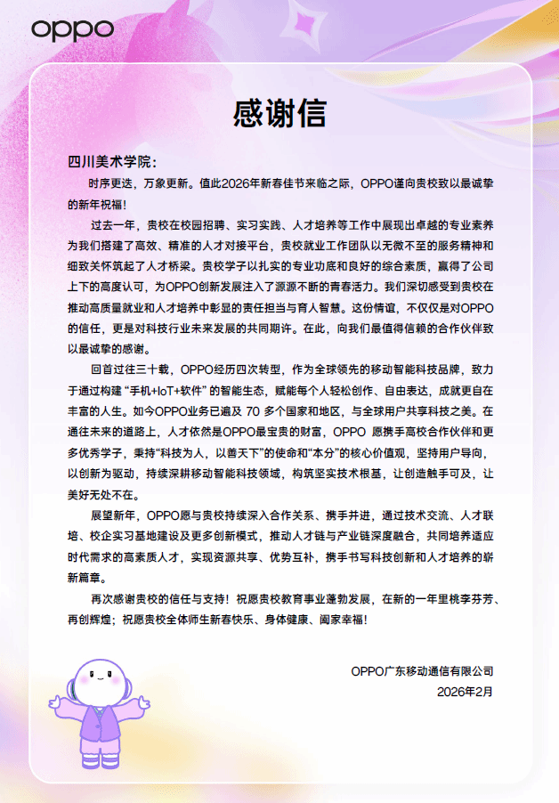 近日,OPPO广东移动通信有限公司向学校发来感谢信,对学校过去一年在校园招聘、实习实践、人才培养等方面给予的大力支持表示诚挚谢意,并高度评价了川美学子扎实的专业功底与综合素质。