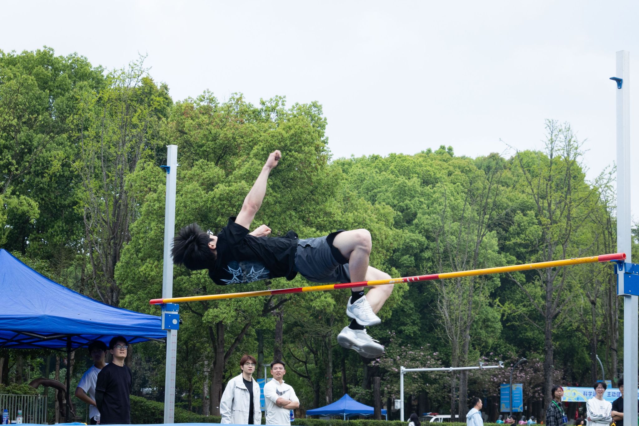 田赛场地,同样精彩纷呈。跳高区,横杆一次次升高,运动员们助跑、起跳、腾空、过杆,如飞燕般轻盈掠过,每一次成功的挑战都是对自我极限的超越。跳远沙坑旁,选手们加速冲刺,奋力向前,在空中划出一道道有力的弧线,扬起的沙粒见证了他们对更远目标的渴望。铅球场上,健儿们将全身的力量凝聚于掌心,奋力一掷,沉甸甸的铅球在空中划出完美的抛物线。