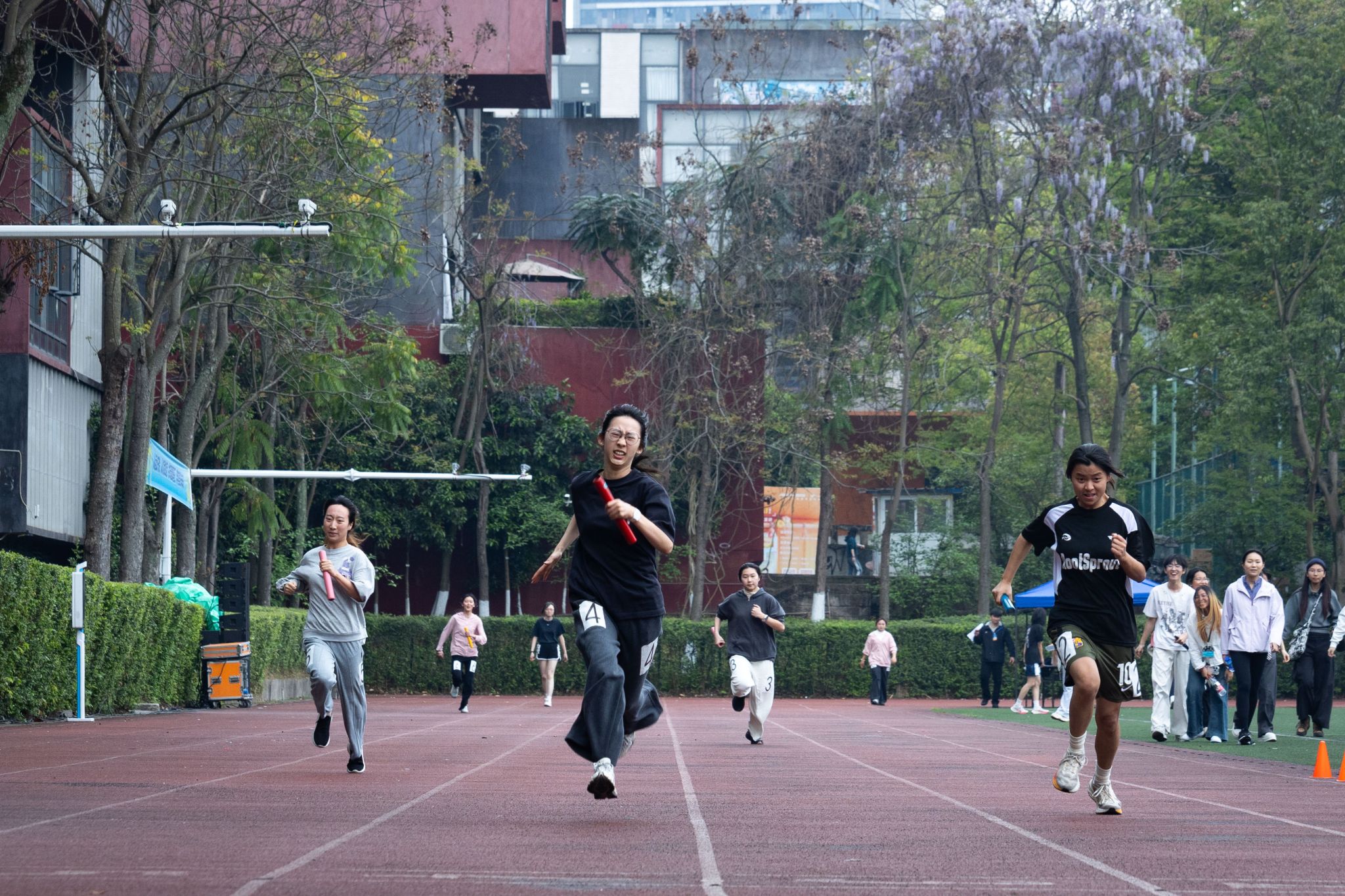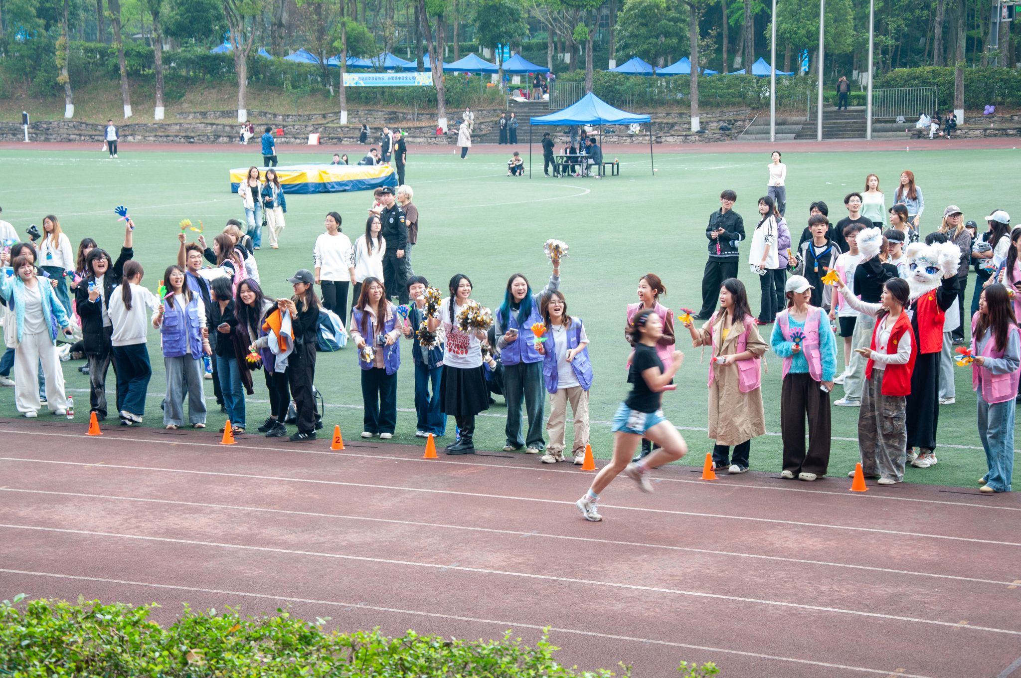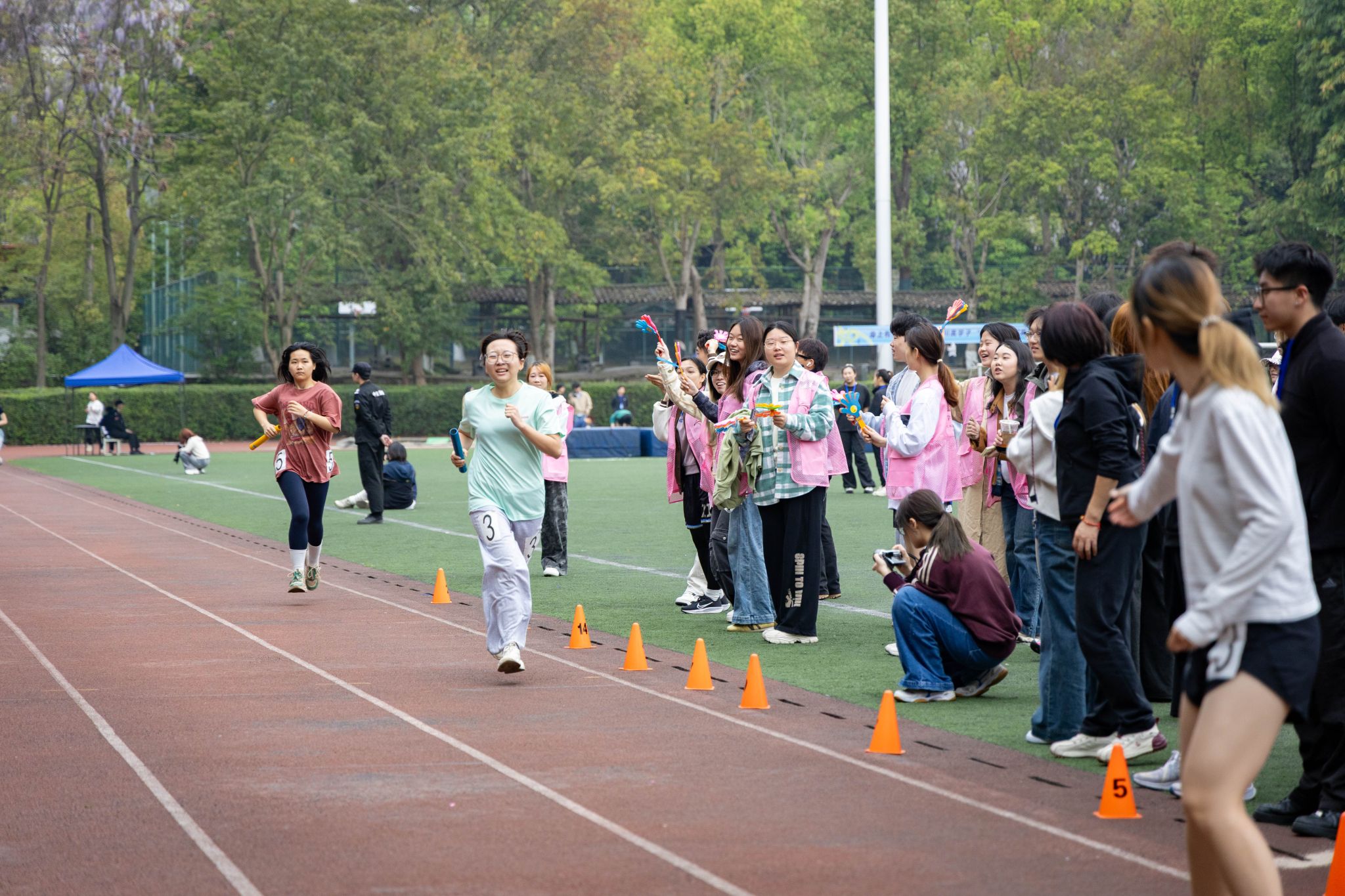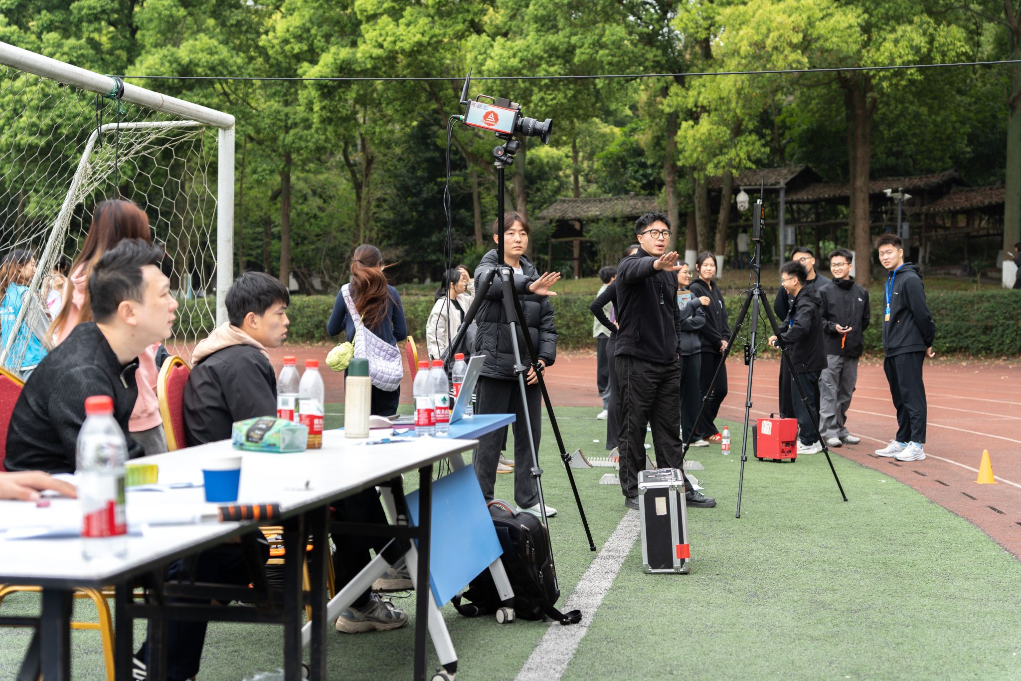 赛场上的精彩,同样离不开赛场之外的默默支撑。当运动健儿们成为全场的焦点,还有一群“幕后英雄”在默默守护着这一切。裁判员们目光如鹰,紧盯着每一个细节,掐准每一秒、丈量每一寸,用严谨与公正为赛事保驾护航。体育组的老师和工作人员贯穿赛前、赛中、赛后,事无巨细、全力保障,每一个环节都凝结着他们的坚守与付出。广播站的同学用激昂的嗓音,实时播报着赛况与来自各学院的加油稿,让热情的声音传遍每一个角落。摄影师们则扛着设备,或蹲或趴,穿梭于赛场各角落,只为捕捉运动员们最飒爽、最动人的那一瞬。随处可见的志愿者们维护秩序、引导路线、递送物资,用微笑与汗水筑起了最温暖的保障。赛场边的观众挥舞彩旗,为每一次坚持鼓掌,为每一次全力以赴喝彩,呐喊声此起彼伏。正是因为有了这些场外人员的辛勤付出与无声守护,这场关于青春与拼搏的盛会才得以更加圆满。