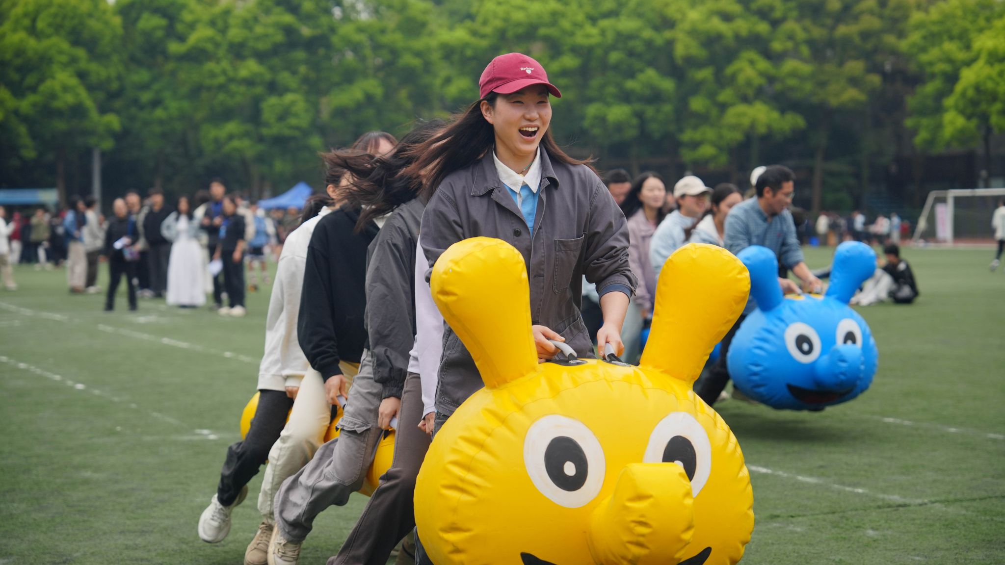 集体趣味项目区域,无疑是欢笑与呐喊声最密集的“能量场”。拔河赛场上,队员们咬紧牙关,身体后仰,双脚如钉般扎在地面,将“力拔山兮气盖世”的豪情展现得淋漓尽致。“充气毛毛虫”比赛中,队员们骑跨在色彩鲜艳的“毛毛虫”上,步调一致地奋力向前“蠕动”。“袋鼠跳接力赛”与“跳大绳”现场,同样热火朝天,选手们套上麻袋,化身一只只灵动的“袋鼠”,在跳跃中传递着信任与希望;长绳在空中划出优美弧线,队员们鱼贯而入,轻盈起落,每一次完美的衔接都凝聚着无数次练习的默契。六人七足、30米迎面接力、投壶……每一个项目都不只是体力的角逐,更是默契与向心力的考验。大家心往一处想,劲往一处使,为了共同的荣誉而战。