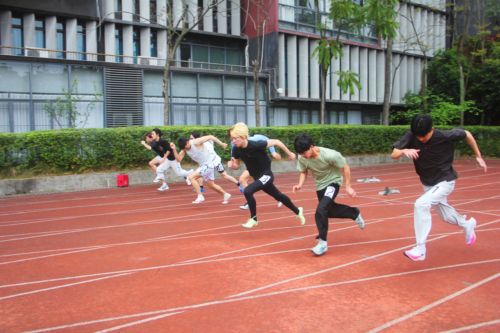 红色跑道上,速度的比拼从未停歇。发令枪响的瞬间,运动员们如离弦之箭,冲向终点,摆臂、迈腿、加速,每一步都充满了力量。他们目光如炬,紧盯前方的终点线,任凭风声在耳畔呼啸,用汗水诠释着对速度的极致追求。接力跑中,选手们稳稳传递承载全队期望的接力棒,交接棒的瞬间,是信任的托付,更是团结的象征。