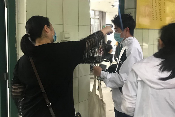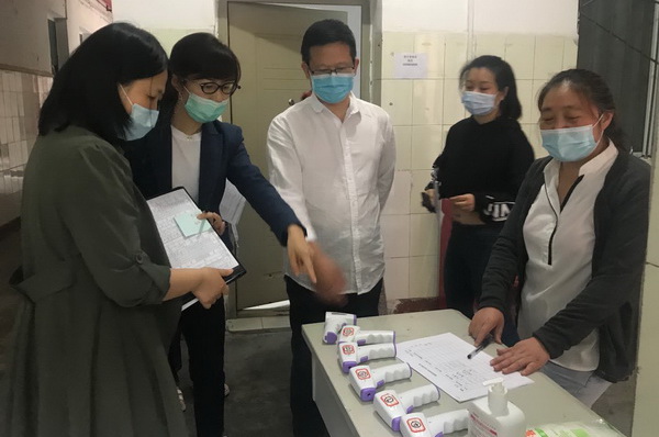 检查中,学院领导仔细检查每栋教学楼执行疫情防控措施和师生执行疫情防控相关管理规定的情况。每栋教学楼都设置了防疫设备派发点,每间教室都张贴了疫情应急处置流程。教师们均提前到岗为学生逐一测量体温并进行登记,所有师生均佩戴了口罩。