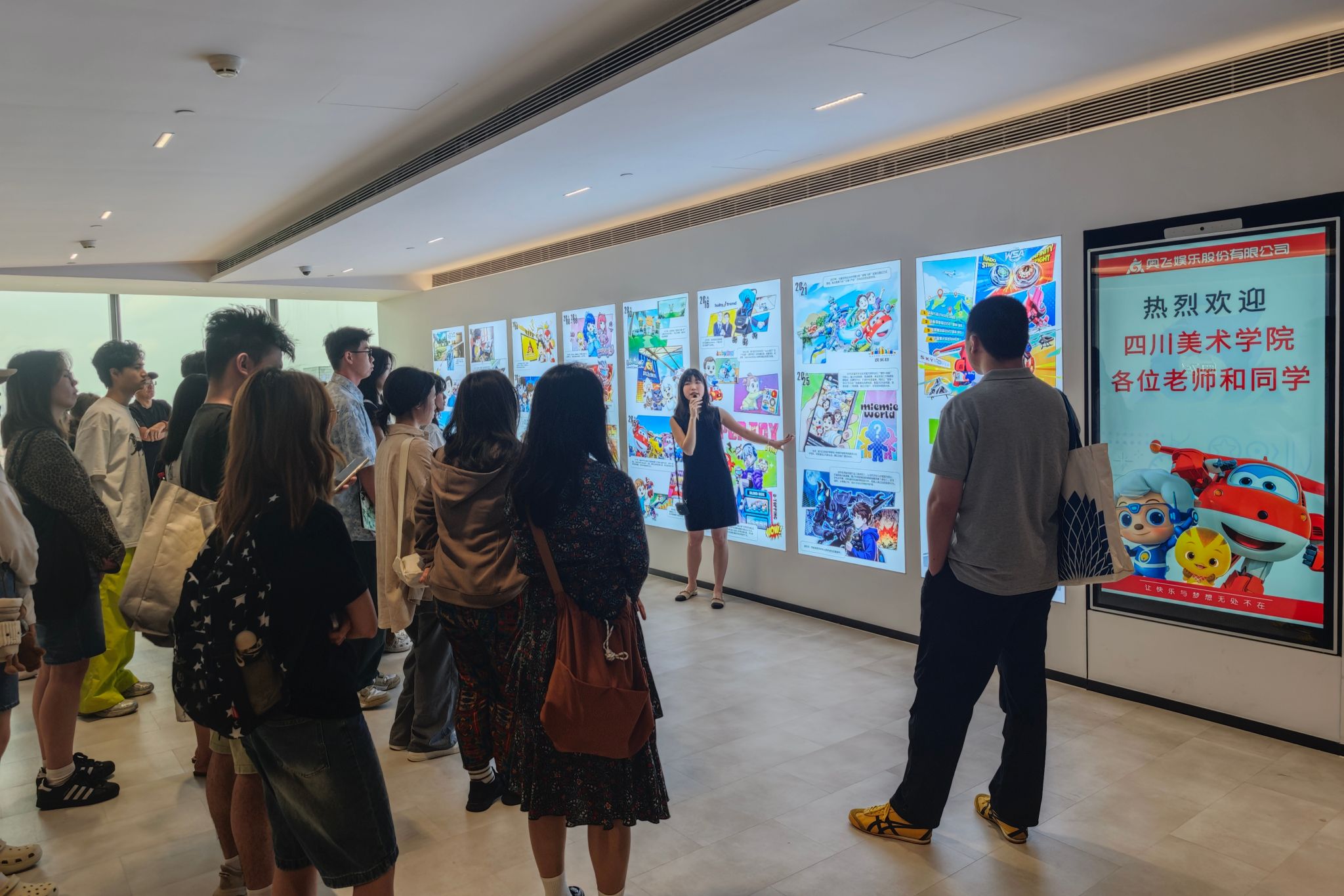 走访期间,学院一行联合在粤进行专业考察的2023级三维动画班师生,先后前往奥飞娱乐、网易互娱、四三九九小游戏、金山软件西山居工作室等行业上市公司和头部企业实地调研。师生走进企业创作一线,实地了解影视动画、游戏美术、数字内容创作、三维动画制作等核心岗位的工作流程、职业发展路径与用人标准,直观感受AI浪潮助推行业更新下的数字创意产业前沿发展动态与岗位能力要求。