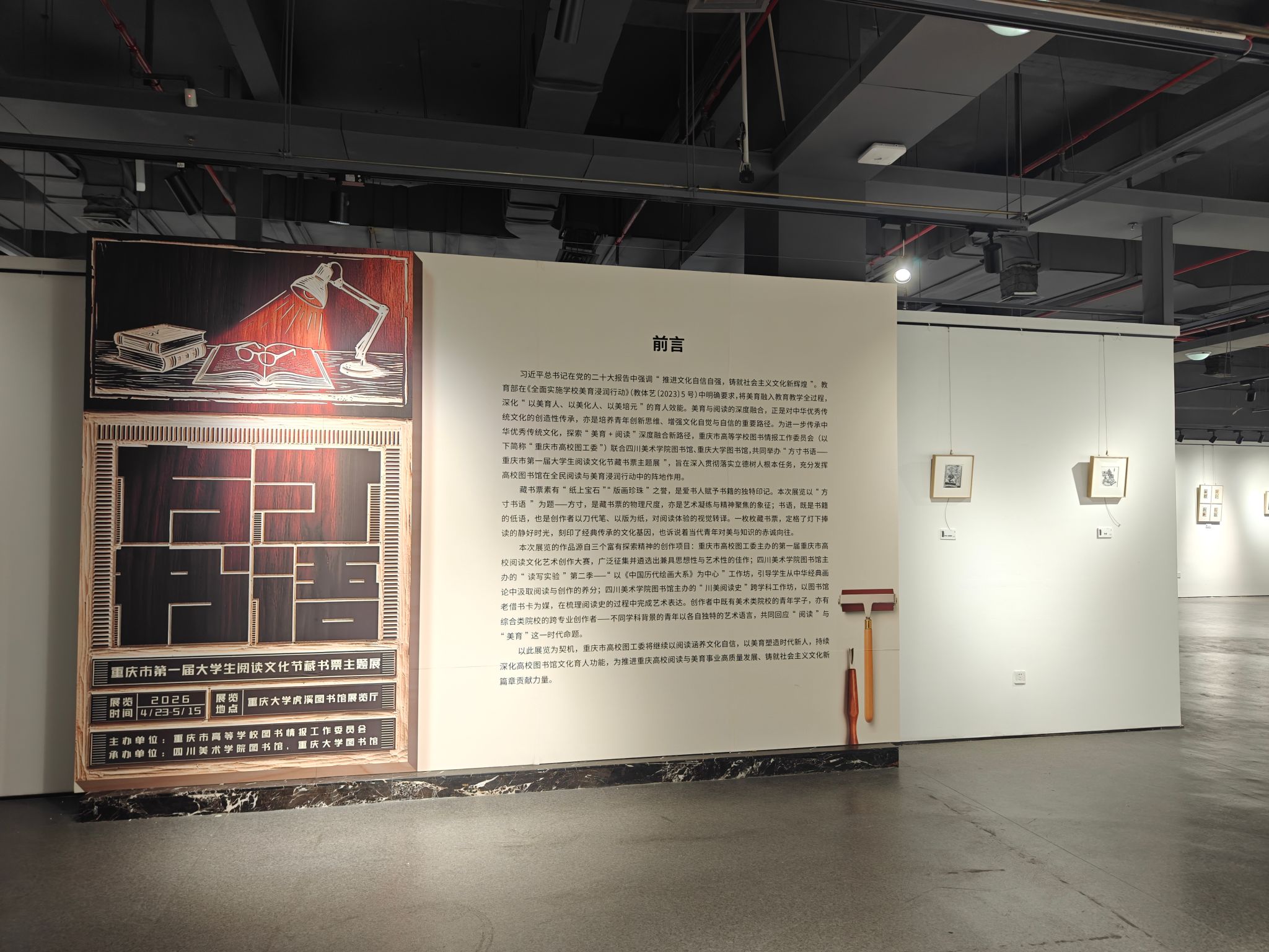 重庆市第一届大学生阅读文化节以“书香巴渝・阅见青春”为主题,是全市高校深入推进全民阅读、加强美育浸润行动的重要平台。本次藏书票主题展立足阅读文化,融合美育主题,通过藏书票这一艺术载体,促进全民阅读精神与大学生美育的有机结合。展览作品源自三大创作项目:重庆市高校阅读文化艺术创作大赛优秀作品、“读写实验”工作坊以《中国历代绘画大系》为中心的创作、“川美阅读史”跨学科工作坊的成果。这些作品以方寸之幅,定格灯下捧读的静好时光,刻印经典传承的文化基因,凭借清晰、亲和、具有感染力的视觉叙事,将展陈空间转化为一堂生动的“美育+阅读”现场课堂。