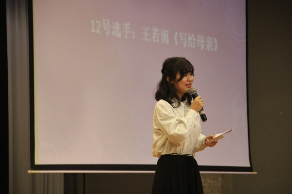 经过初赛的激烈角逐,来自各学院的十二名选手进入了决赛。决赛分为彼此唱和、声临其境、才华横溢三个环节。“彼此唱和”环节要求选手两两搭档模拟一个特定的场景主持。选手们在此环节充分展现了自己的语言天赋和主持风采,尤其是七号、八号选手搭档的体育栏目主持,振奋人心,十分出彩,赢得了评委老师和全场观众的热烈掌声。“声临其境”环节要求选手听背景音乐即兴主持,考验选手们的临场应变能力及快速组织语言的能力。选手们在短短一分钟的准备时间后便能出口成章,令人拍案叫绝。在“才华横溢”的展示环节,选手们带来了节目内容形式多样的展示,包括绕口令、报菜名、评书、小品、音乐剧、独白表演、配音等,让在座的观众意犹未尽。