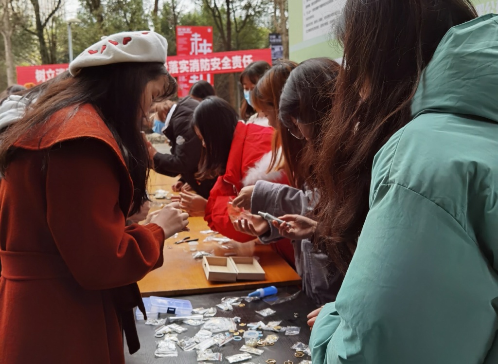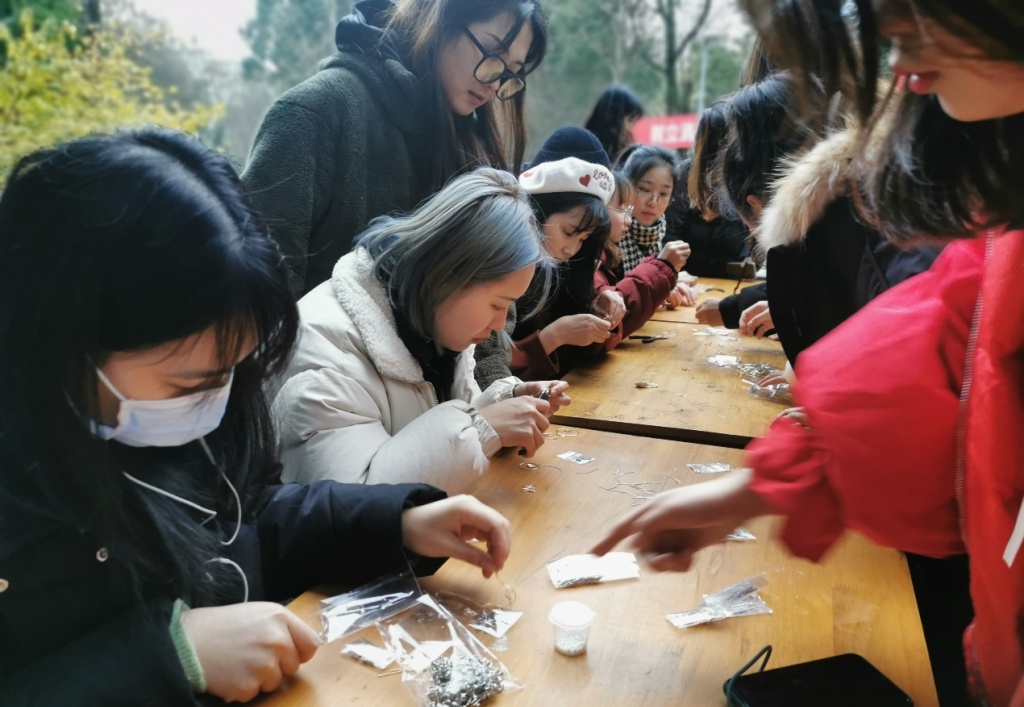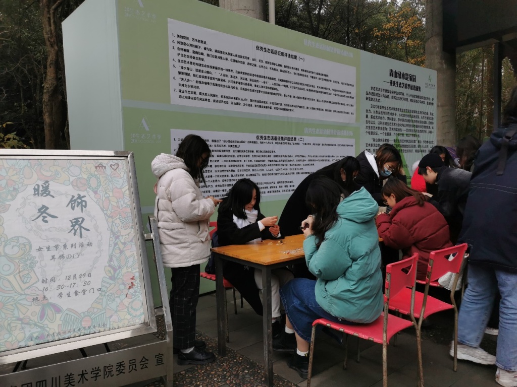 2020年12月29日下午,由共青团四川美术学院委员会主办、四川美术学院校学生会青年志愿者协会承办的“暖冬饰界”女生节耳饰制作活动,在虎溪校区学生食堂门口举行。