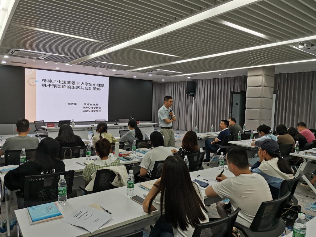 唐海波教授用幽默风趣的语言,结合实际工作中的丰富案例,从心理学和法学角度,深入浅出地分析了高校辅导员应对精神障碍学生相关问题的策略。培训结束后,唐海波教授仔细聆听了辅导员在心理咨询工作中所遇到的疑难问题,并一一答疑解惑。