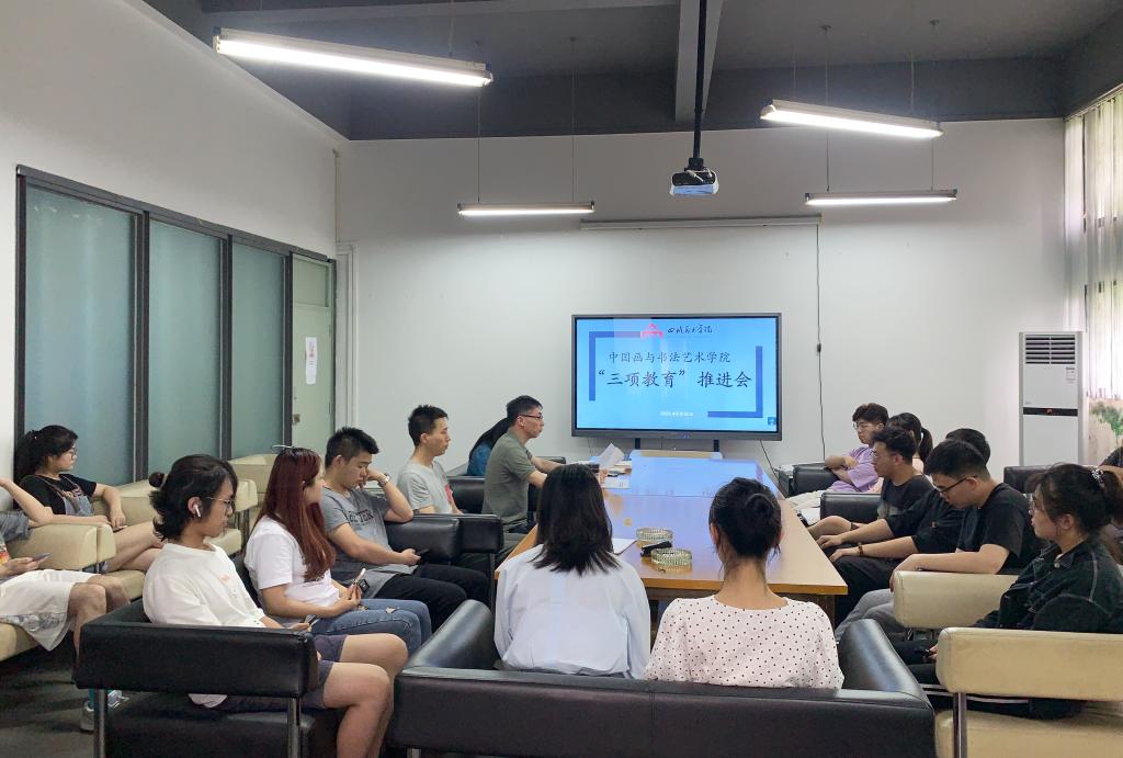 为进一步贯彻落实好学校党委《关于开展“三项教育”实施方案》的文件精神,5月31日下午3点40分,中国画与书法艺术学院在绘画楼三楼会议室召开学院“三项教育”推进会。会议由学院党总支书记柏在华主持,学院辅导员、全体学生干部及部分党员参加了会议。