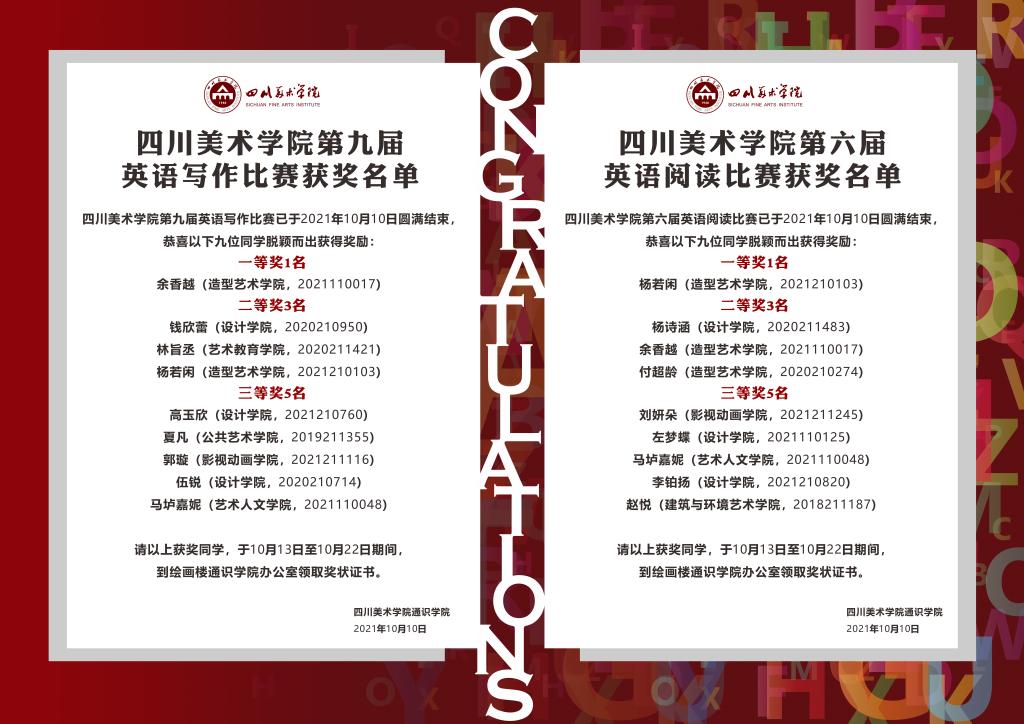 本次赛事历时一月有余,从开学初的宣传到13日晚的演讲决赛,全校共约500名同学报名参加了三大赛。经过激烈的角逐,写作与阅读比赛均有9名选手获得名次,其中排名前四的同学们将代表学校参加市级比赛。而演讲比赛从90多名报名选手中经过初赛的选拔,20位优秀的同学进入最终的决赛。13日晚,20位选手以从容的自信、流畅的语言、睿智的观点以及娴熟的演讲技巧,彻底征服了评委老师和在场观众。本次演讲比赛的主题为“Red Star Over China”(红星照耀中国),选手们以建党百年为出发点,引古博今,歌颂历史、革命、先驱,同时抒发作为当代年轻人应该具备的家国情怀。因此本次演讲比赛不仅是一次语言能力的比拼,也是一次爱国之情的展示。比赛结束,最终来自设计学院的朱宇同获得一等奖,将代表学校参加2021“外研社-国才杯”重庆市大学生英语演讲大赛;一同参加市级演讲比赛(研究生组)的还有来自实验艺术学院研究生胡力文。