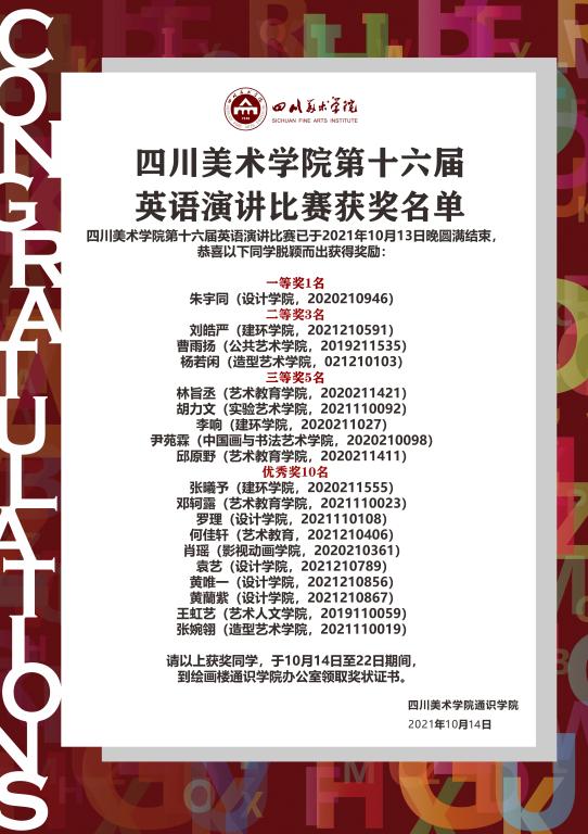 10月13日晚,四川美术学院第十六届英语演讲比赛决赛在绘画楼公共课3教室举行。至此,四川美术学院2021年英语三大赛事圆满落下帷幕。