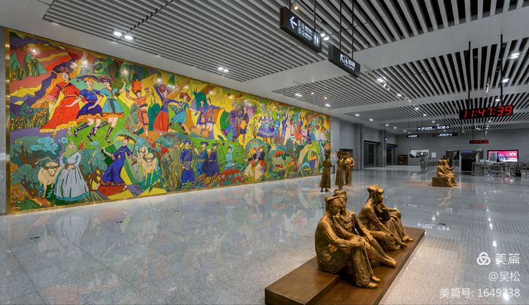 在《多彩贵州欢迎您》的主题下,机场站壁画由高大的全景式墙面马赛克构成。