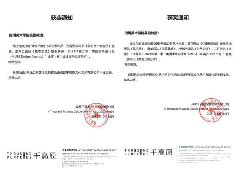 近日,美国缪斯设计奖(MUSE Design Awards)2021第二届全球获奖榜单公布,由中标设计单位成都千高原文化艺术有限公司推送申报、我校吴松教授主创的成都地铁5号线皇花园站《花重锦官》壁画、贵阳地铁二号线泉湖公园站《生态之城》壁画、贵阳地铁二号线机场站《多彩贵州欢迎您》壁画,一起荣获2021第二季“美国缪斯设计奖(MUSE Design Awards)”金奖(室内设计类别公共艺术)。人民网、光明网、中新网、成都日报、四川发布、贵阳电视新闻等媒体进行了广泛报道。