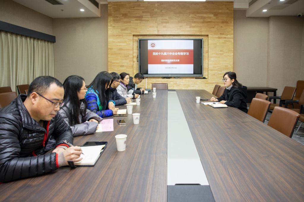 12月14日上午,机关党委组织部、统战部党支部在学校三会议室专题学习党的十九届六中全会精神。支部书记江俊蓉以“深刻理解‘两个确立’的决定性意义”为题,为支部全体党员上了一堂专题党课。
