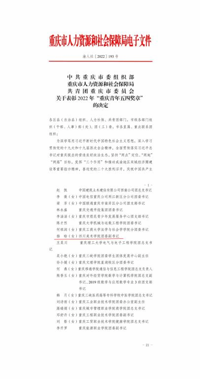 过去的2021年,在党的领导下,广大团员青年和各级团组织勇于担当、积极作为,在推进重庆经济社会发展中做出了重要贡献,涌现出一批事迹突出的先进典型。“五四”前夕,重庆市一批优秀青年个人和集体获“五四表彰”。市人力社保局、团市委联合表彰了100个“重庆市五四红旗团委(团支部)”、100名“重庆市优秀共青团员”、99名“重庆市优秀共青团干部” 。其中,我校杨晗老师获评“重庆市优秀共青团干部”称号。