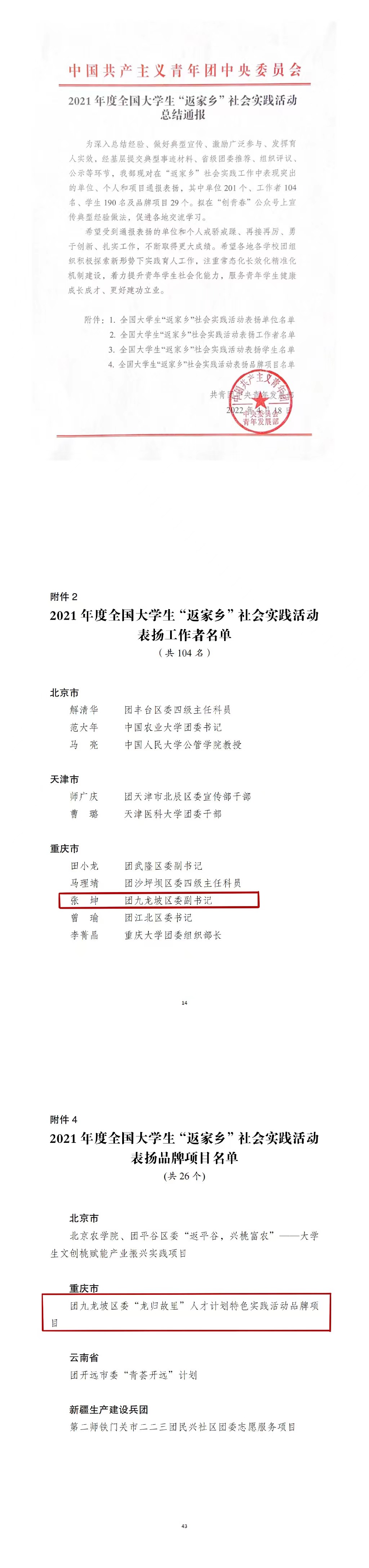 近日,团中央开展2021年度全国大学生“返家乡”社会实践活动总结通报工作,对在“返家乡”社会实践工作中表现突出的单位、个人和项目进行通报表扬,其中单位201个、工作者104名、学生190名及品牌项目29个。我校团委张坤作为突出工作者获通报表扬,同时打造“返家乡”品牌项目,作为重庆市唯一入围全国优秀品牌项目获通报表扬。