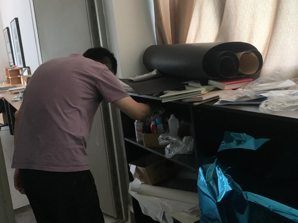 版画系主任舒莎与臧亮、刘铃涛两位老师一起,对版画系进行了全面检查,重点检查了易燃易爆物品,将版画系工作室的易燃物品放在箱子用水垫底冷却,就存在隐患部分进行了及时妥善的处理。