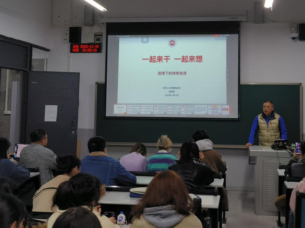11月19日下午,艺术人文学院党总支采取线上、线下相结合的方式,组织全体师生党员、发展对象和入党积极分子上了一次疫情期间的特殊党课。学院党总支书记、副院长杨茂森同志在设计楼C栋第17教室, 为学院在校的全体党员、发展对象和入党积极分子上了题为《一起来干,一起来想》的特殊党课。校外的党员通过腾讯会议认真聆听了党课。