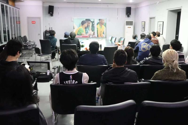 在2022卡塔尔世界杯开幕前,部分学生来信表示希望学院能提供一个场所,让同学们一起观看世界杯。收到相关意见后,学院迅速作出安排,并向同学们发出世界杯观赛邀请。在严格执行疫情防控规定的前提下,学院于11月22日晚在二楼会议室组织了40余名足球爱好者观看阿根廷对战沙特阿拉伯的比赛,并为同学们准备了饮料、零食。