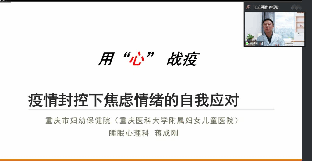 近期,面对复杂严峻的疫情形势,同学们容易产生焦虑情绪,影响其学习和生活。为了帮助同学们更合理地面对焦虑情绪,更积极地应对疫情期间的生活,11月22日晚,学生处心理健康教育中心邀请重庆市妇幼保健院睡眠心理科主任蒋成刚,举办疫情期间心理减压沙龙。本次沙龙活动围绕“疫情封控下焦虑情绪的自我应对”主题,帮助大家缓解焦虑情绪,在疫情下实现自我的成长。