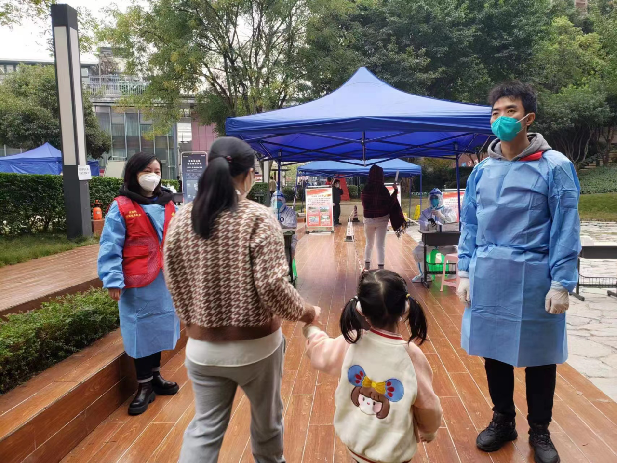 2020级研究生党员江殷洁同学在接到学校下发党员、干部下沉基层到社区报到的通知之前,就已经在巴南区麻柳嘴镇麻柳社区担任志愿者,站在了防疫第一线!她与社区工作人员一起走访排查,维持核酸检测现场秩序,并进行消毒工作。