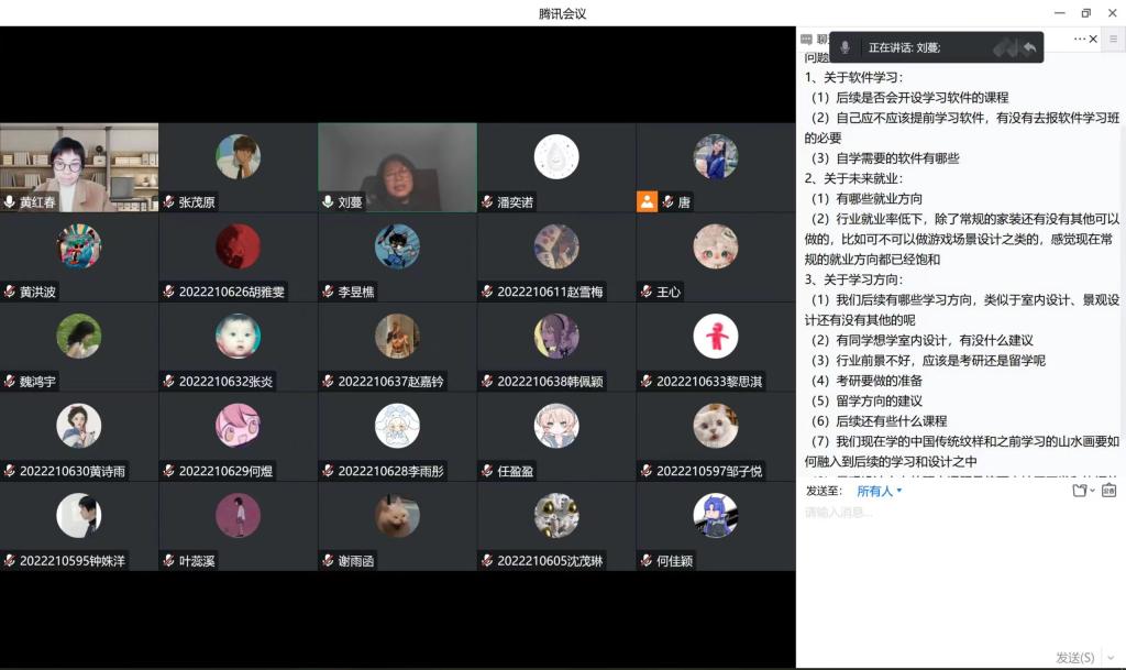 环境设计系沙龙由黄洪波系主任组织,首先通过调查问卷的方式搜集了同学们关于“软件学习”“未来就业”和“学习方向”三个方面的问题,针对这些问题,刘蔓教授以“分享职场”为讲题分享了如何在学习和生活中学会感恩、尊重他人,以及利用时间投资自己;建筑系沙龙由郭辉系主任组织,郭辉老师与杨健老师通过谈心的方式,针对疫情防控常态化下的“建筑行业就业口径”“建筑师职业规划”“留学深造”三个问题进行了互动和解答,同学们积极发言,本次沙龙活动效果显著。风景园林系沙龙由王平妤系主任组织,主要围绕大学四年的学习重点、能力、知识及素养三方面展开,王平妤老师和祈润钊老师结合同学目前的状态给出了许多建设性建议,并从个人兴趣和专业积累入手,启发大家打开大学学习的开关。
