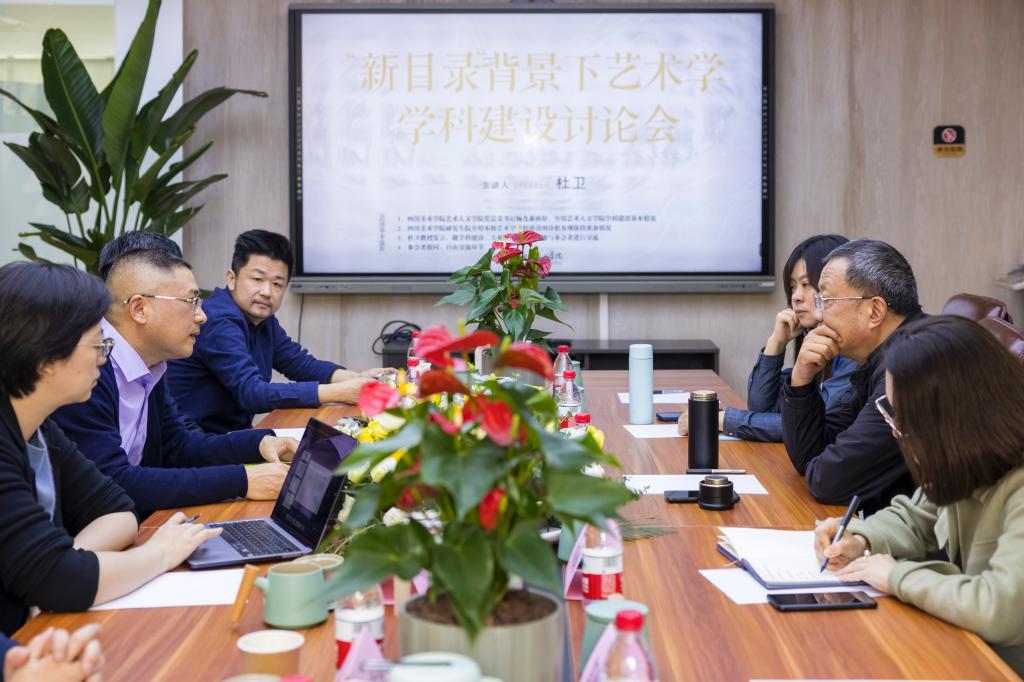杨茂森介绍了艺术人文学院的发展和目前学科专业建设的基本情况,提出“新目录”背景下艺术学学科建设发展所遇到的问题和困惑。谢亚平介绍了学校整体情况,谈到对艺术学学科建设的一些思考。尹丹介绍了艺术学学科建设的初步设想。大家与杜卫教授在现场进行了交流。