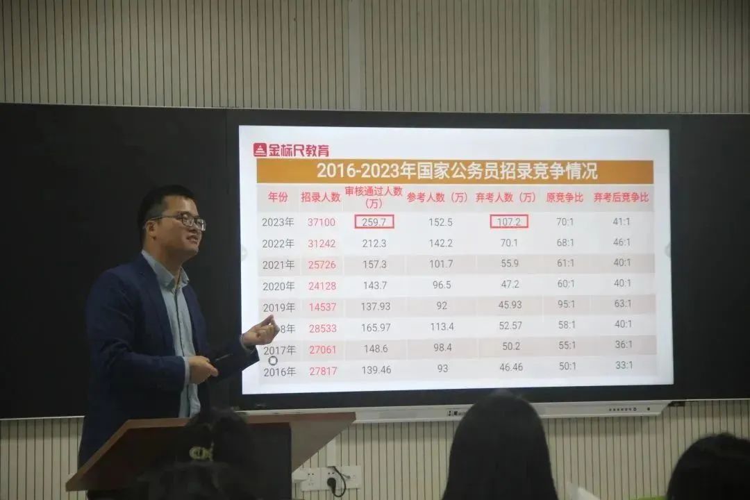 田西山以《公职就业,路径与选岗分析》为主题,向同学们讲述了自己以往在考公入编教育上的指导经验。他从“大学毕业生三大就业方向分析”“公务员与事业单位:待遇、发展分析”“应届生报考诀窍:规划、选岗、备考”三个方面与同学们进行了交流讲座。并且,针对本学院艺术史论与美术学专业,田西山介绍了依据本专业报考的国家公务员招录的相应单位,讲解了公考基本招录流程,并进行了简略的考情分析,表达了对同学们未来前景的美好祝福。