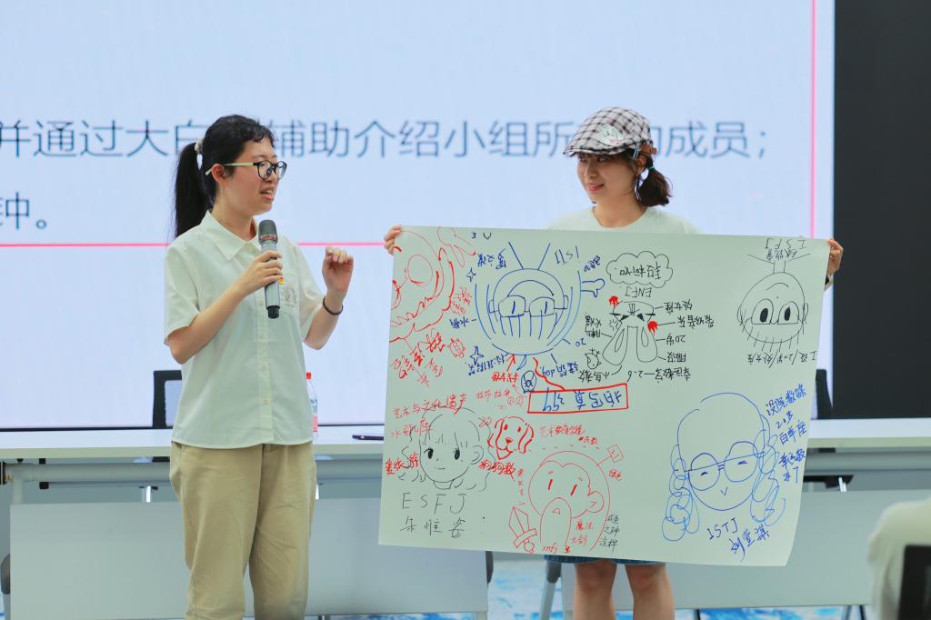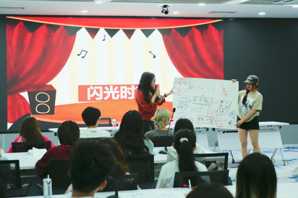 紧接着,逯璐带领学员开展团建项目。首先通过向全体学员分享自身经历及职业生涯,向学生传递了职业发展规划中各阶段职业选择和锻炼的重要性;随后带领学员开展分组团建,通过现场游戏将59名学员随机分为7组,经过30分钟的小组讨论和组内协商,各选派出一位代表介绍小组成员、队名及团队创作等,进一步锻炼学生沟通能力,拉近学员距离,加强团队意识和凝聚力;最后逯璐通过“我们可以成为谁”话题总结提出了学习工作四要素,指出同学们在学习工作生活中应做到待人真诚、工作态度端正、做事积极、工作方式创新等。