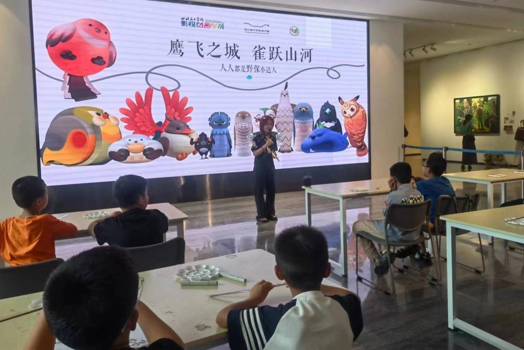 在濒危鸟类野保小课堂动漫工坊公教活动现场,由邱霞老师指导的濒危鸟类主题创作团队和“口袋动物园”团队给12位儿童进行了濒危鸟类野保课堂,向他们介绍了毕业作品中的濒危鸟类模型和创作思路,并且观看了野生动物保护的动画短片,还给濒危动物模型进行涂鸦,充分激发了儿童认识和保护野生动物的热情。