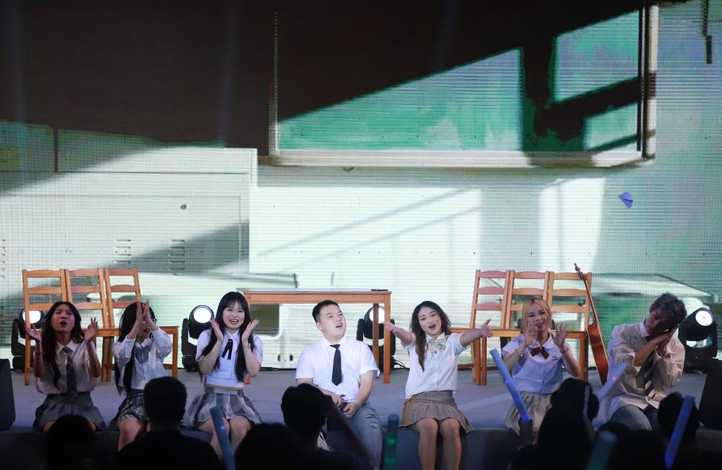 此次音乐会现场还设置了两轮游戏互动环节。第一轮“望图生义”以猜毕业相关词语的形式与现场同学们互动起来。第二轮“我曾路过”则以川美校园里的场景照片进行猜答,增进毕业生们对于母校的感情与留念。全场踊跃参与互动,欢声笑语,气氛热烈。本届毕业音乐会现场还设置了零食区、饮料区,为观众朋友们提供蛋糕、雪糕、童年小零食、可乐汽水等。