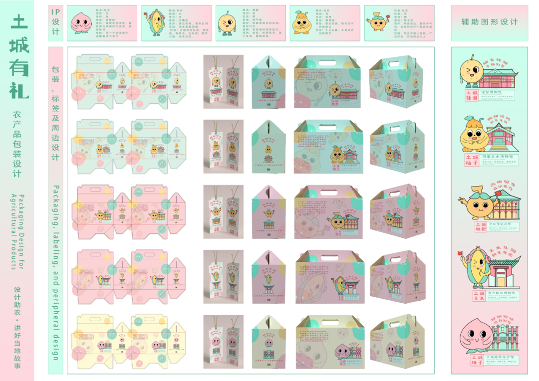本次活动以“学思想、强根基、重履职、建新功”为总要求,在土城镇实施了一组以“融合红色元素,助推红色经济”为主题的设计。为融合红色元素,助推红色经济,团队成员通过座谈、实地调研等方式深入了解土城镇农产品特点后,对其进行包装设计与IP创造,用红色文化赋能经济发展。设计过程中,团队以土城镇的革命历史和红色资源为灵感,结合现代新媒体流行的人物IP设计,给土城主产的蔬果设计了相关IP形象。同时将红色建筑图像化后与其IP形象相结合,进一步宣传土城红色文化,为当地农产品注入新的活力和个性,也为红色经济发展提供了借鉴和思路。