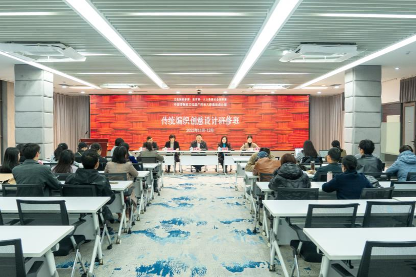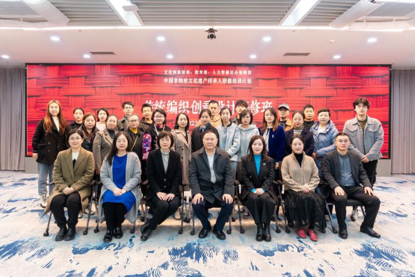 11月16日上午,四川美术学院2023年“中国非物质文化遗产传承人研修培训计划——传统编织创意设计研修班”举行开班仪式。这是四川美术学院参与文化和旅游部、教育部、人力资源和社会保障部“中国非物质文化遗产传承人研修培训计划”以来举办的第十二期研培班。重庆市文化和旅游发展委员会党委委员、副主任朱茂,重庆市文化和旅游发展委员会非物质文化遗产处处长严小红、四川美术学院艺术人文学院副院长董虹霞、艺术人文学院教师代表和全体参训学员参加开班仪式。