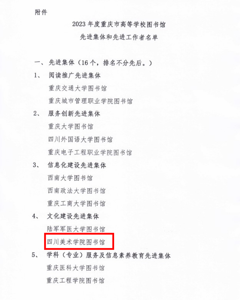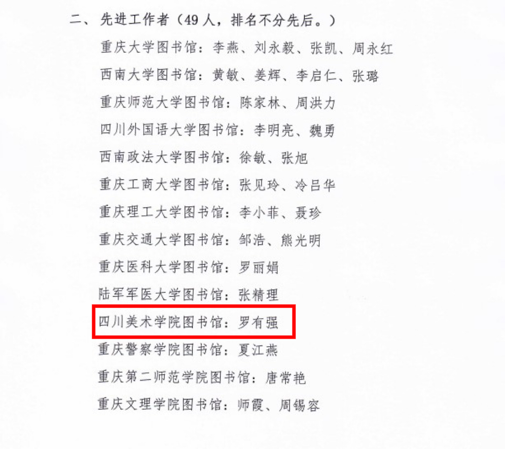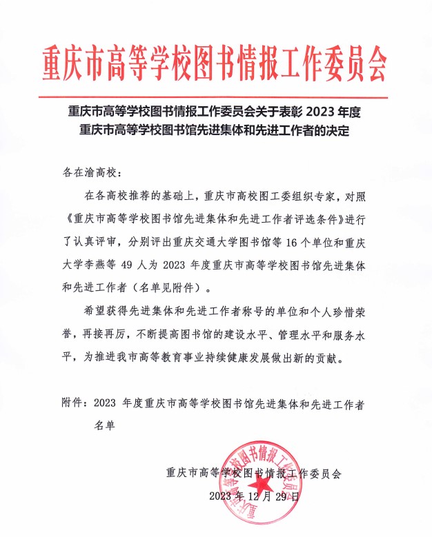 近日,重庆市高等学校图书馆情报工作委员会发布《关于表彰2023年度重庆市高等学校图书馆先进集体和先进工作者的决定》,我校图书馆荣获“2023年度重庆市高等学校图书馆文化建设先进集体”;图书馆罗有强同志被评为“2023年度重庆市高等学校图书馆先进工作者”。