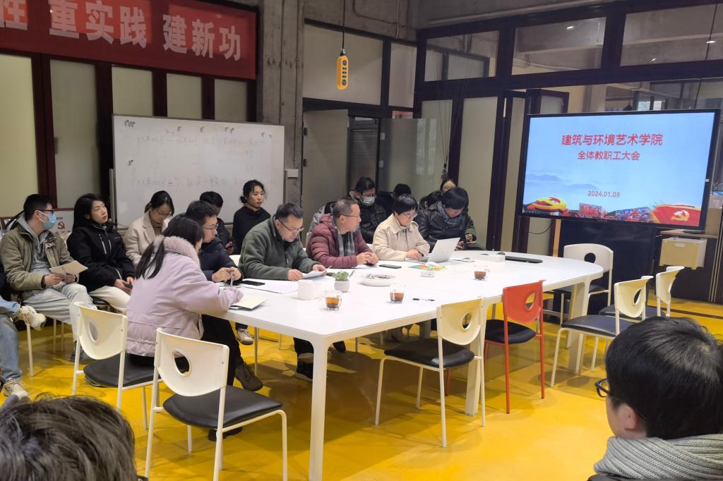 2024年1月9日下午,建筑与环境艺术学院召开2024年1月教职工大会暨政治理论学习会,会议由党总支书记刘建峰主持,学院党政领导班子及全体教职工参会。