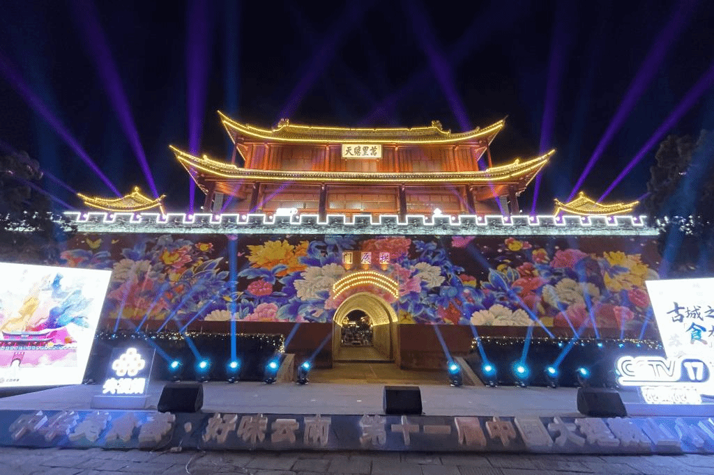 设计学院师生将教学课程与设计实践有机结合,立足巍山本地历史文化提出了大量设计创意方案,共同开展了活动主视觉设计、巍山特色小吃创意海报设计、大集摊位设计、街区门头设计、墙体投影设计、艺术灯笼设计、展演灯光设计等。活动引起了广泛关注和强烈反响,艺术灯笼、墙体投影、展演灯光让古城独具特色,吸引众多游客纷纷驻足打卡;以拱辰门城墙投影为背景的央视直播活动获全网600万人观看,相关话题关注量高达1.2亿;特色海报在全国七大城市地标建筑点亮,并在“央视三农”媒体平台展播,中央广播电视总台农业农村节目中心对此次设计活动进行了专题采访和报道。
