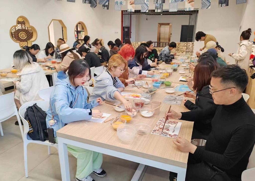 工作坊师生还参观了非遗蜡染的制作现场,调研目前蜡染传承的现状与困境,与参加非遗学习的小朋友展开互动交流,通过观摩蜡染的制作过程感受到传统技艺的朴实艳丽之美,思考与关注非遗保护与传承。