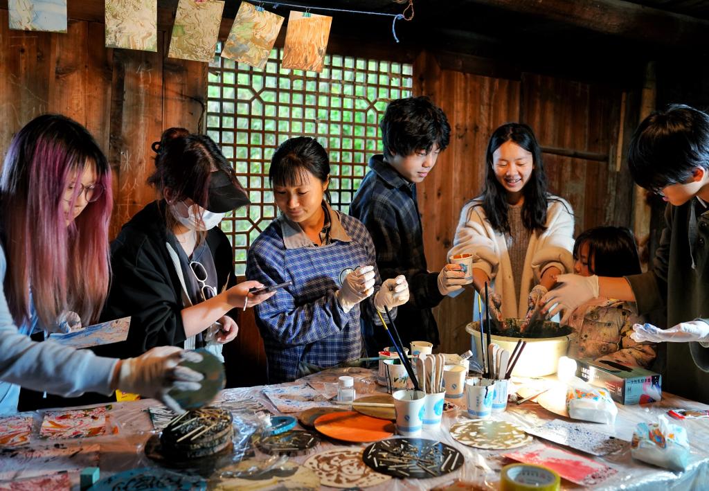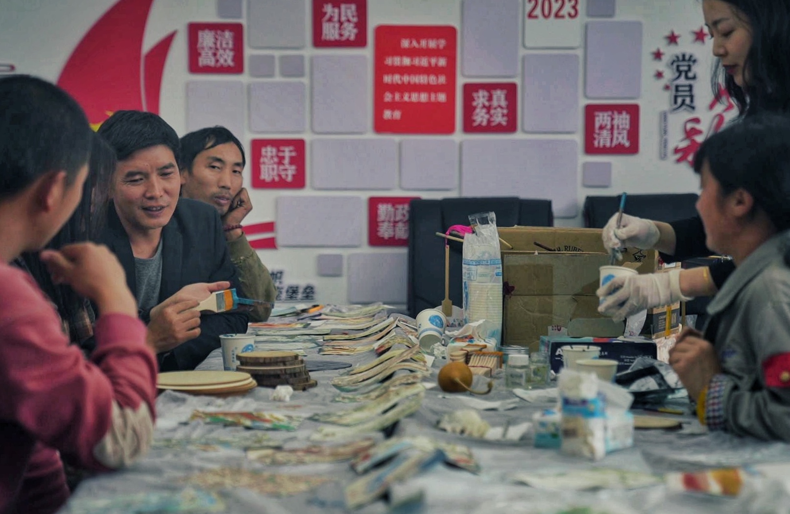 4月11日至13日,张剑与杨倩云先期到达中心村为村民开设漆艺工作坊,实践辅导基本的漆艺知识和创作,让村民掌握漆艺制作的基本方法,设置中心村漆艺体验工坊,优秀的村民学员成为第一批漆艺传习者。4月16日,村民齐素霞将学习到的漆艺技法讲授给影像工作坊的师生,共同制作漆艺产品。
