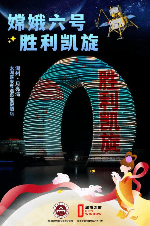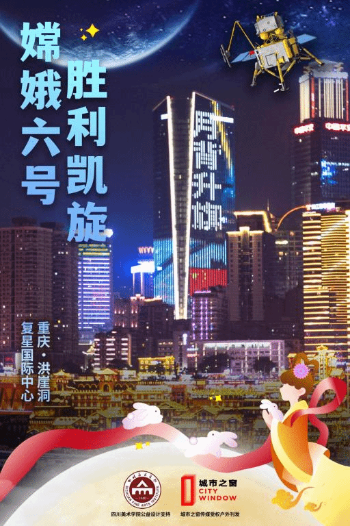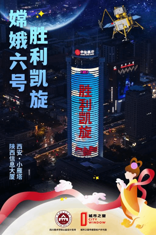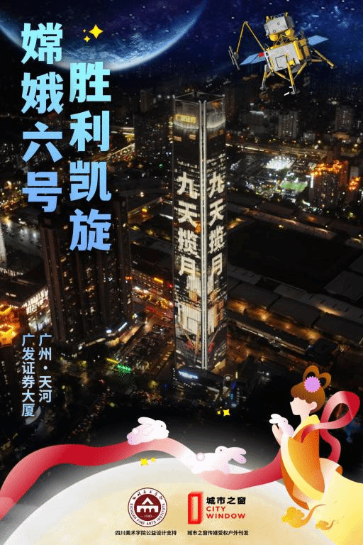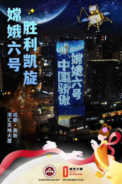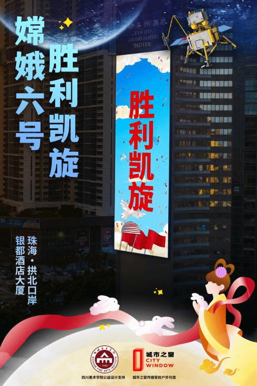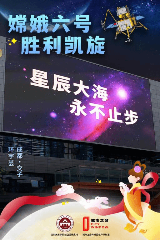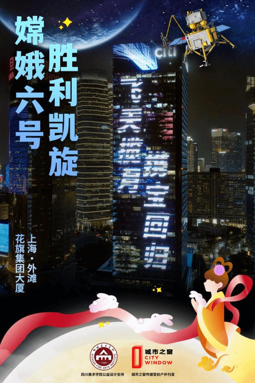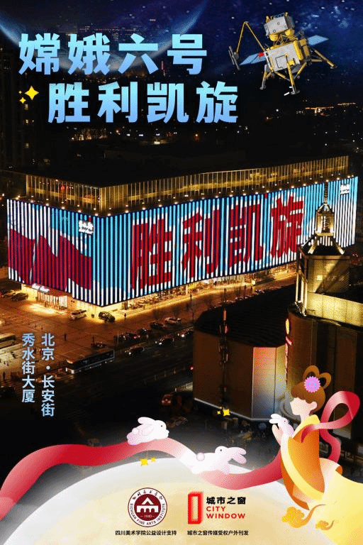为了庆祝航天史上这一壮举,我校设计学院师生受国家航天局新闻宣传中心委托,设计了动态海报,联合上海城市之窗传媒,以楼宇灯光秀的形式点亮北京、上海、广州、成都、重庆、西安、珠海、潮州等8个城市的9座地标建筑。“飞天揽月 携宝回归”“嫦娥六号 中国骄傲”“月宫挖宝 胜利凯旋”“星辰大海 永无止境”等巨幅标语,搭配精美动态图形点亮城市夜空,吸引了大批行人驻足打卡,达到了鼓舞民众、振奋人心的效果。国家航天局新闻宣传中心官媒“中国的航天”报道了此次宣传活动。