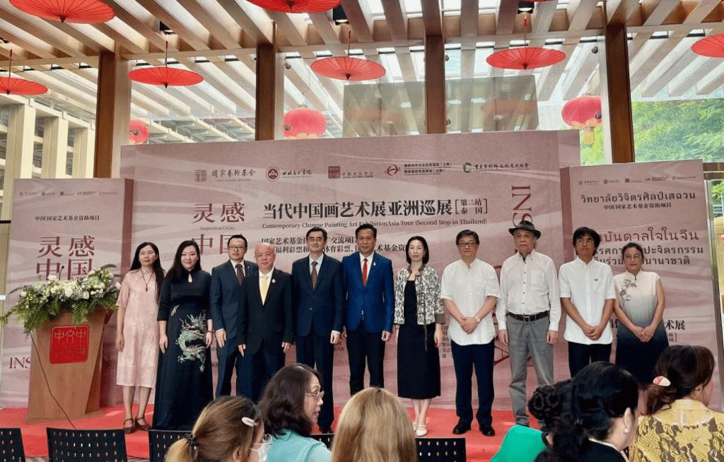 近日,国家艺术基金2023年度传播交流推广资助项目“灵感中国——当代中国画艺术国际巡展”在曼谷中国文化中心开幕。中华人民共和国驻泰王国大使馆公使衔参赞常禹萌,中国美术馆原副馆长、中央美术学院教授胡伟,曼谷中国文化中心兼中国驻曼谷旅游办事处主任阙小华,北京大学艺术学院原副院长丁宁等领导和专家以及来自泰国各界人士100余人出席了开幕式。开幕式由四川美术学院副教授张湸主持。