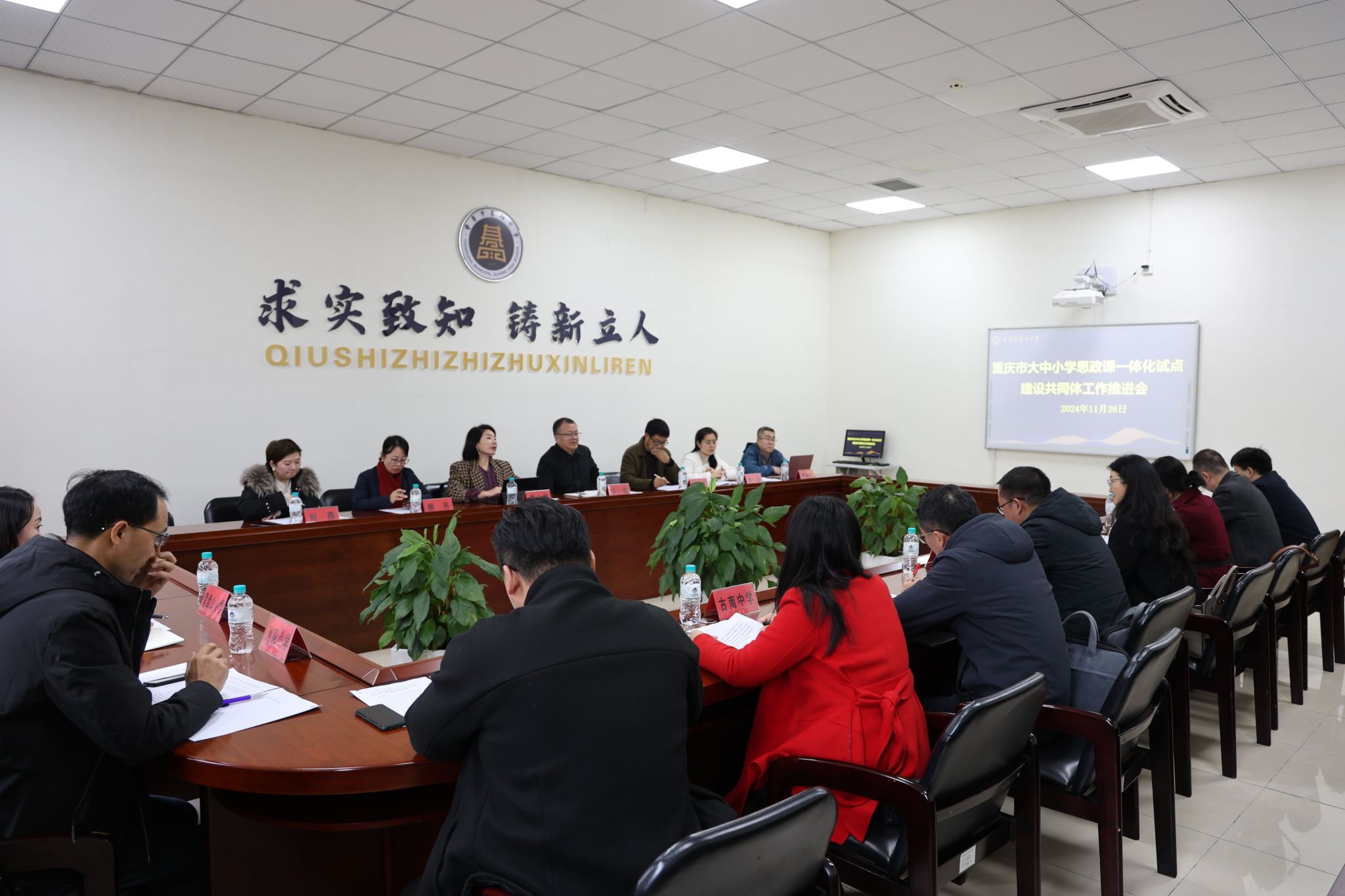 11月26日,由四川美术学院和綦江区教委牵头,重庆课堂内外融媒体有限责任公司、课堂内外智慧美育研究院、重庆市綦江中学等10个成员单位共同组成的重庆市大中小学思政课一体化试点建设共同体工作推进会在重庆市綦江中学举行。四川美术学院原党委副书记、马克思主义文艺理论中国化研究中心主任左益,马克思主义学院院长陈斌一行与綦江区教育工委书记、区教委主任蒲德莉,教育工委委员刘谦,教委体卫艺科科长戴倩以及课堂内外智慧美育研究院,綦江区教育科学研究所,綦江区共同体单位代表参会。会议由綦江区教育工委书记、区教委主任蒲德莉主持。