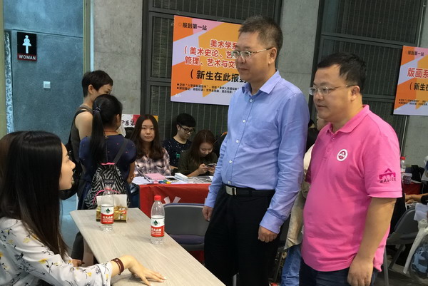 党委书记黄政、党委副书记左益亲临现场检查指导迎新工作情况。逐一走访了各院系迎新接待点,认真查看各院系迎新工作的组织和开展情况,仔细询问了新生报到进展情况、报到人数、住宿情况等,对迎新工作人员和学生志愿者付出的辛勤劳动致以慰问和感谢。